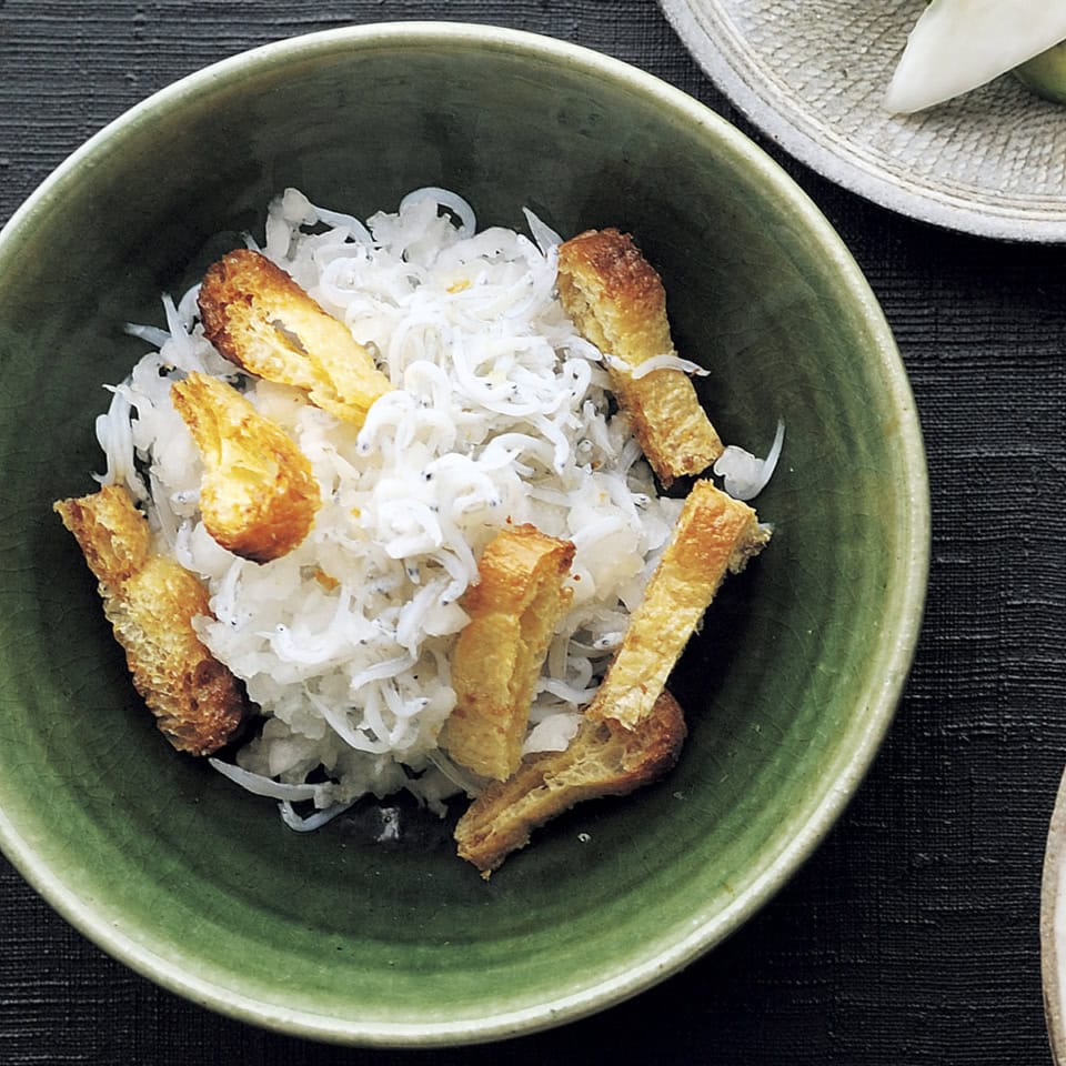 ②油あげはグリルなどで両面をパリッと焼いてから5㎜幅に切り、しょうゆで和える。