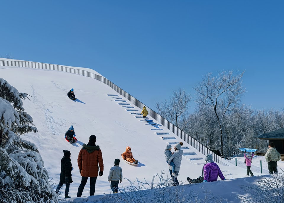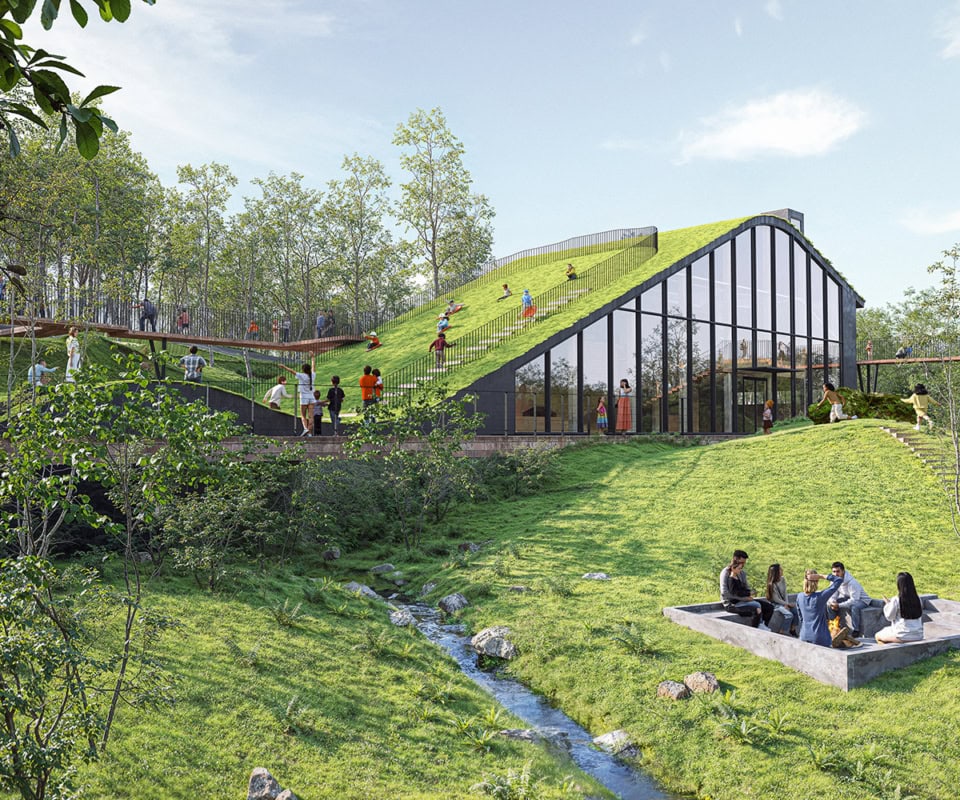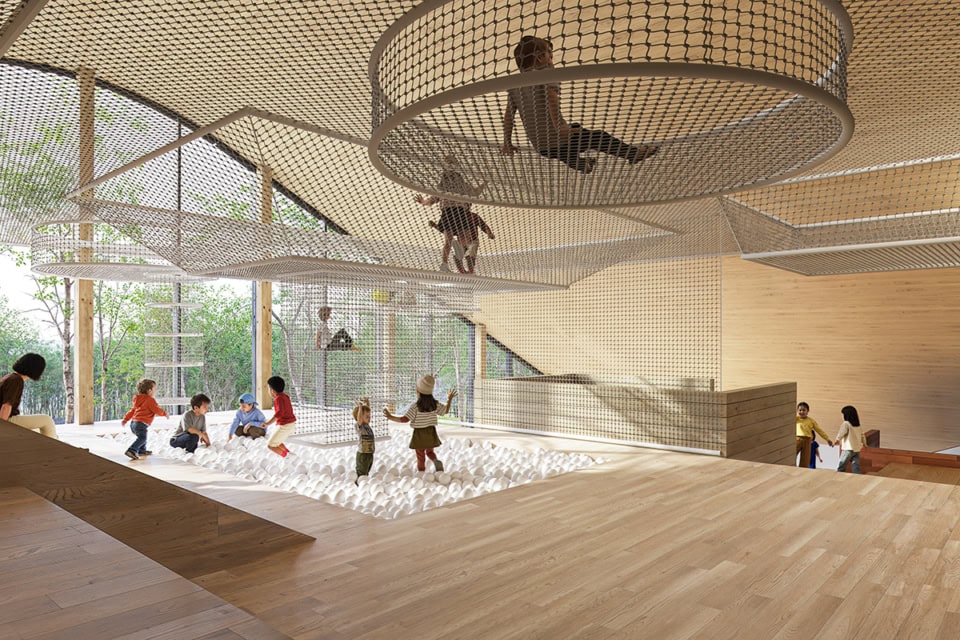 目を引くのは、草スキーやそり遊びもできる大屋根スロープ。大自然のなかで、自由に走って、登って、滑って。夏は涼やかな森で思いきり外遊び、冬は雪に覆われた大屋根でそり遊びを楽しめます。温かな室内にもアスレチックがあり、本を読んで過ごすこともできます。
