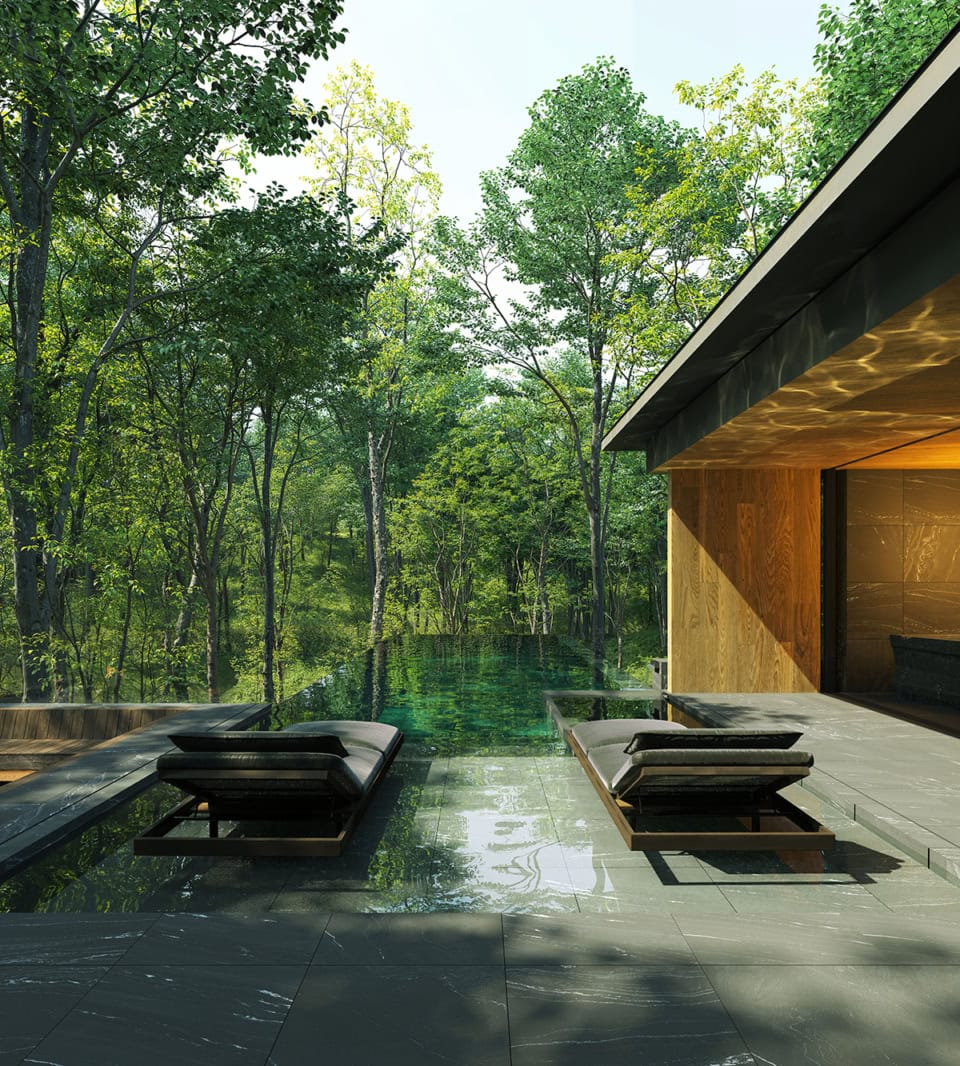 そんなフラッグシップハウス「IRORI」をバージョンアップさせた新ハウス「IRORI 2.0」が誕生! 新たにインフィニティプールを備え、象徴的な囲炉裏を囲む座席も、よりゆったりと寛ぐことができるソファ席へとリニューアル。全2棟のうち1棟はドッグランを完備したペットフレンドリーモデルです。