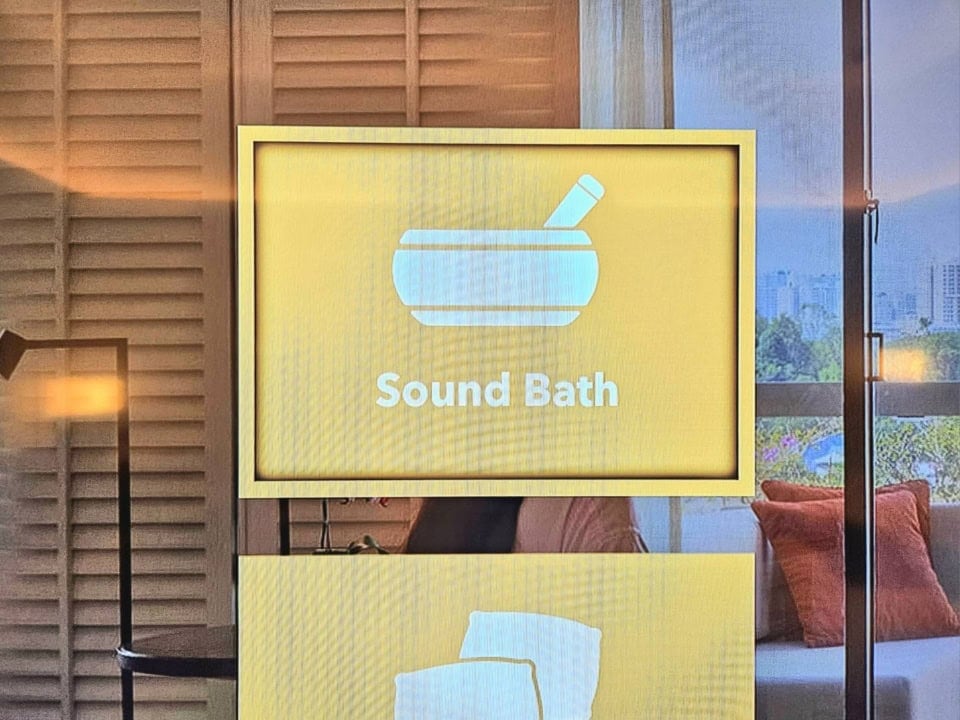 ほわわわわわ~~~~ん! サウンドバスとは、クリスタルボウルやチャイムなどを用いて奏でる瞑想なんかにいい音楽体験のこと。このホテルオリジナルの動画が、エンドレスで流れるのです!