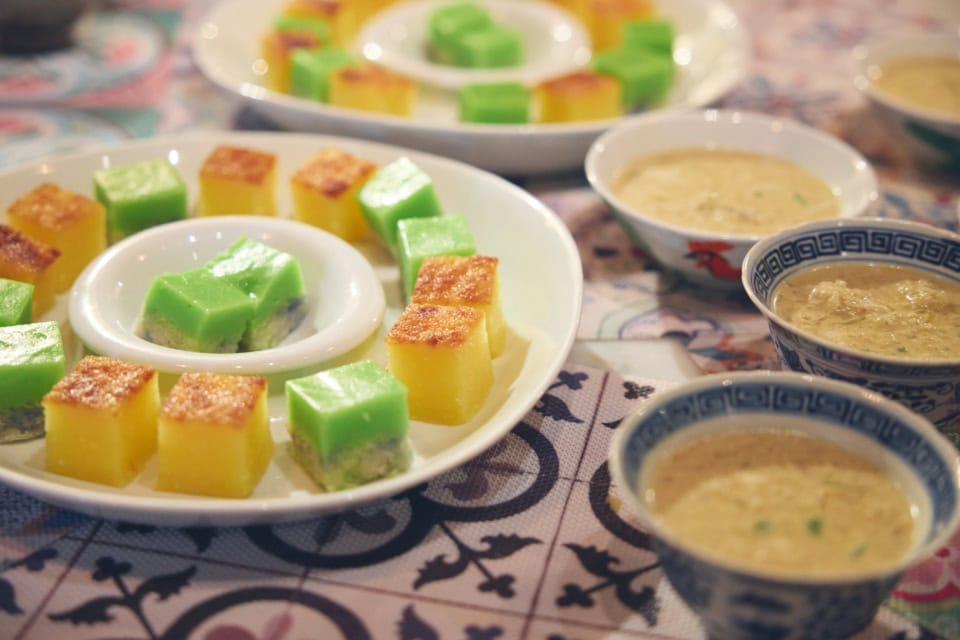 おやつターイム!右は冷たいココナッツミルクに緑色のゼリーが入ったチェンドールでかき氷っぽさがあり、個人的に大好物なお味でした。左はカスタード味のもち米のケーキと、あずきとパンダンリーフの葉で色づけした緑色のゼリーがドッキングしたケーキ。見た目も可愛いし、味はやさしい!