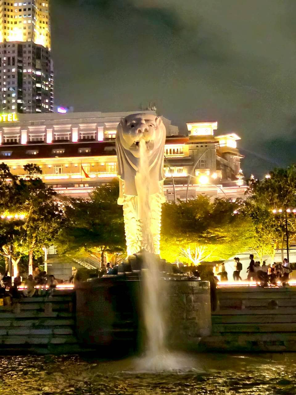 ちなみにシンガポールリバーの上流、クラークキーに船着き場があるリバークルーズのコースによってはマーライオンを正面から拝めるスポットに連れて行ってくれます。ナイトリバークルーズで私が撮影したマーライオンがこちら。夜も元気に、水吐いてる~!