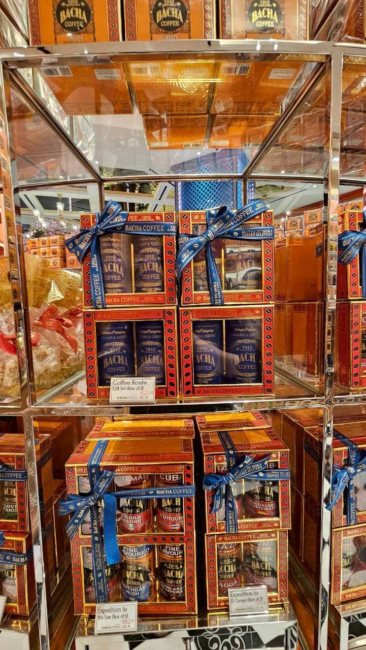 おしゃれなコーヒー豆のギフトセットもあり。この青いリボンはショッピングバッグにも巻いてくれるんです。