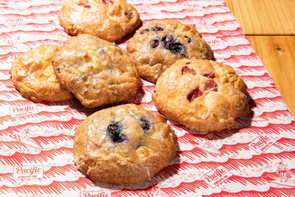 フルーツの甘みとクリームチーズの塩っ気が絶妙なスコーン。手前・右上ブルーベリー、右・上ストロベリー、中・バナナ、左・パイナップル各¥330