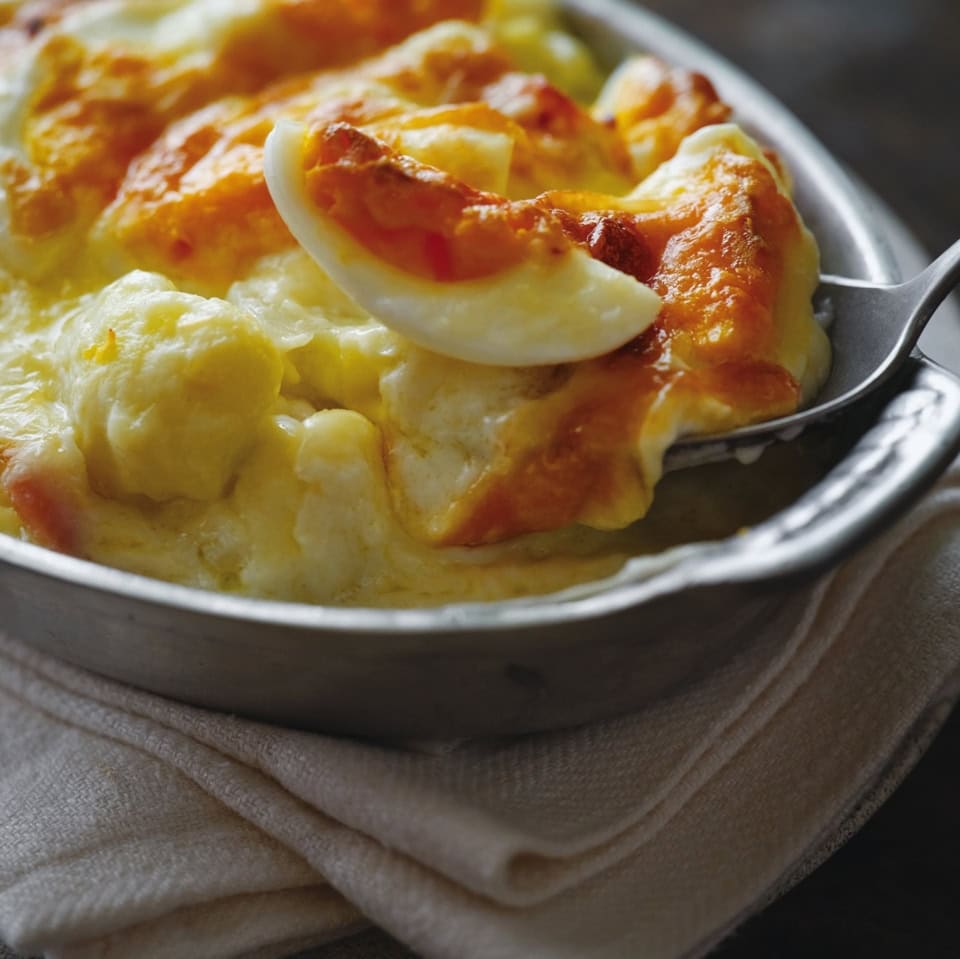 バター代わりに「オリーブオイル」で!冬のごちそう『ハム、卵、カリフラワーのオイルグラタン』