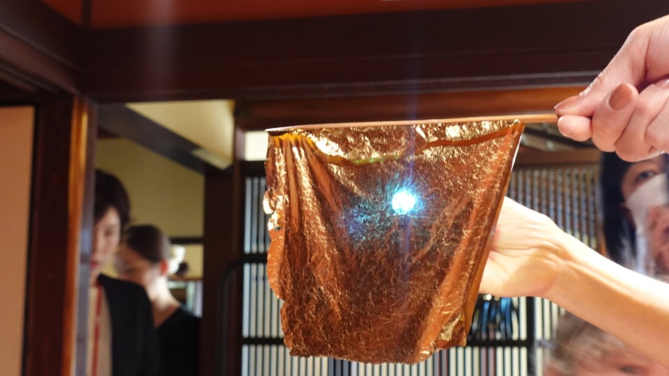 紙のように引き伸ばされた金箔って、ライトの光が透けてみえるほど薄いんです。