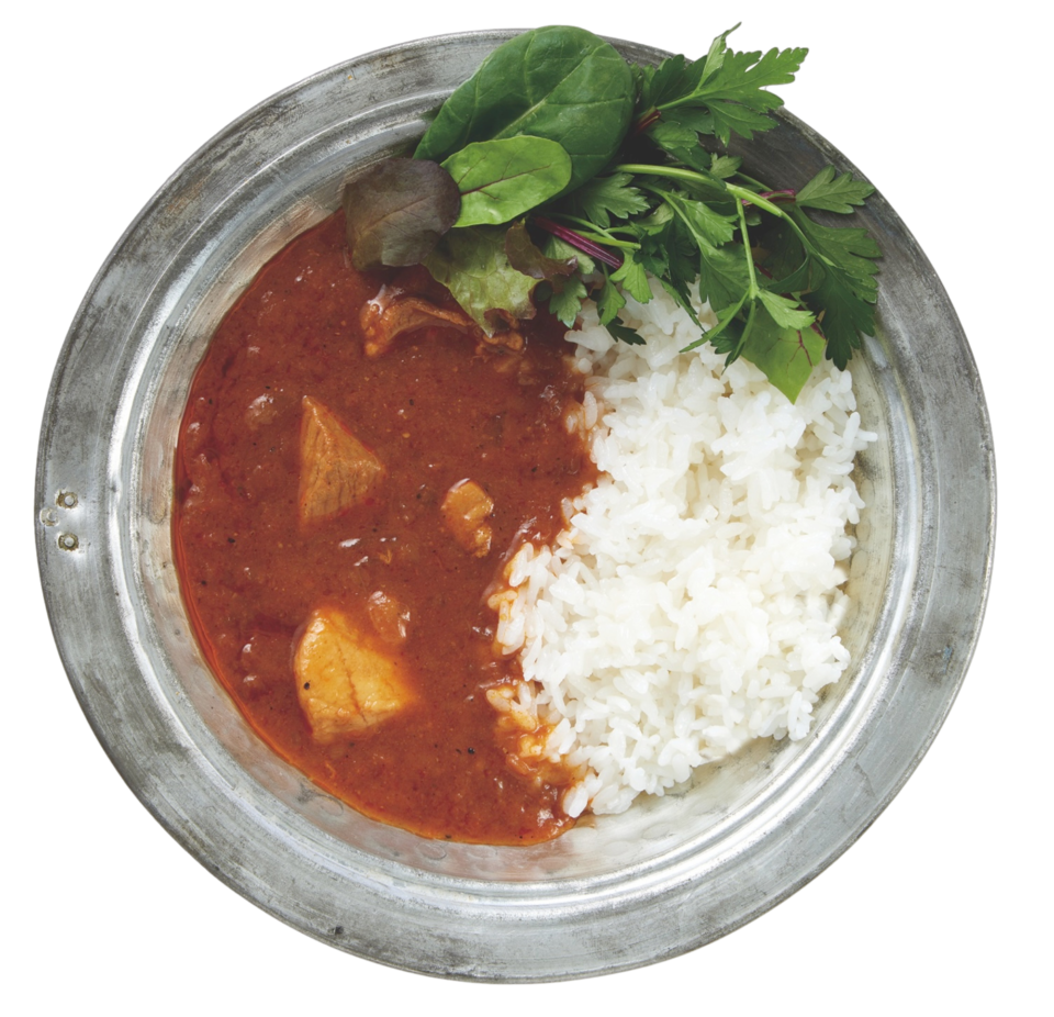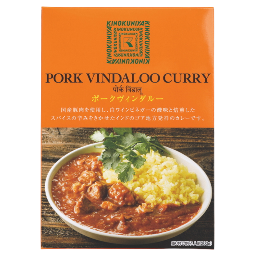 インド西海岸ゴア地方に伝わる白ワインビネガーの酸味と焙煎したスパイスの辛みが特徴のカレー。国産の豚肉がゴロッと入った本格的な一皿。¥697(紀ノ国屋)