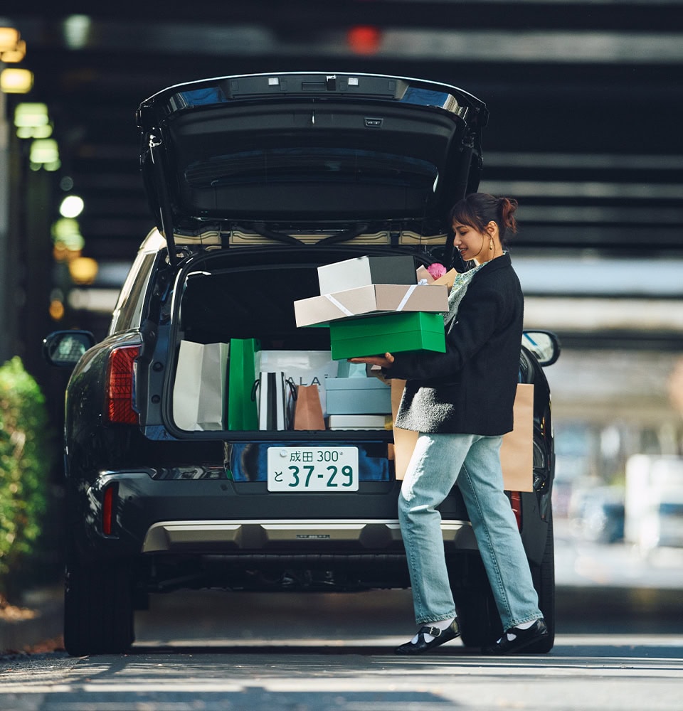 MINIらしいキュートさと本格SUVのイイとこどりの【MINI Countryman】。カントリーマンのサイズはぜんぜんミニじゃない! 運転席や助手席のゆったり感はもちろん、後部座席とラゲッジスペースは驚くほどのゆったりとした空間です。チャイルドシートでの子どもの乗せ降ろしもしやすく、女子旅で荷物が多くても、家族ドライブでバギーがあってもらくらく積み込めちゃうのが嬉しい。後部座席を倒せばさらに大容量にスイッチします。
