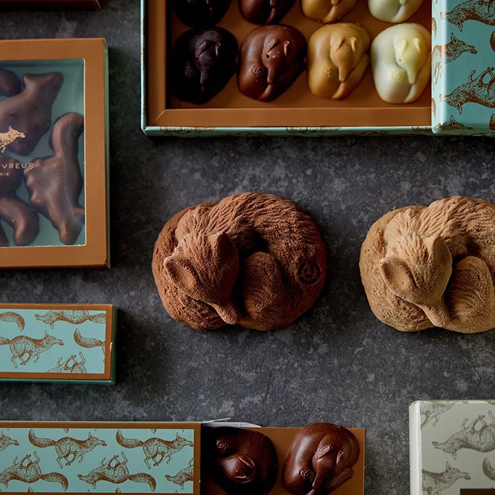 人工的な保存料や香料は一切使わないのがシェフの哲学。ブランドのアイコンである「キツネ」の形をしたショコラに表現される、素材を最大限に生かしたエレガントな味わいは、一流の料理人が仕立てるような、緻密なショコラと評されています。