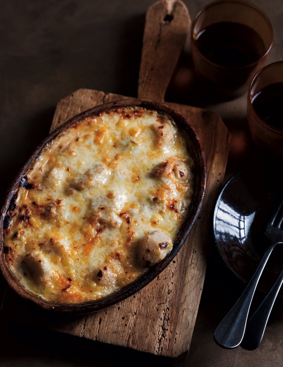 小麦粉不要。牛乳をしっかり煮詰めることと里いもの粘りで、濃厚なグラタンに。みそは香りが飛ばないよう、最後にプラス。
