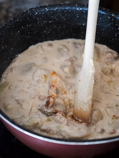 ③ ❷に牛乳を加え、ときどき混ぜながら、とろみがつくまで20~25 分煮詰める。みそを加えて混ぜ、味を見て足りなければ塩を加えて調える。