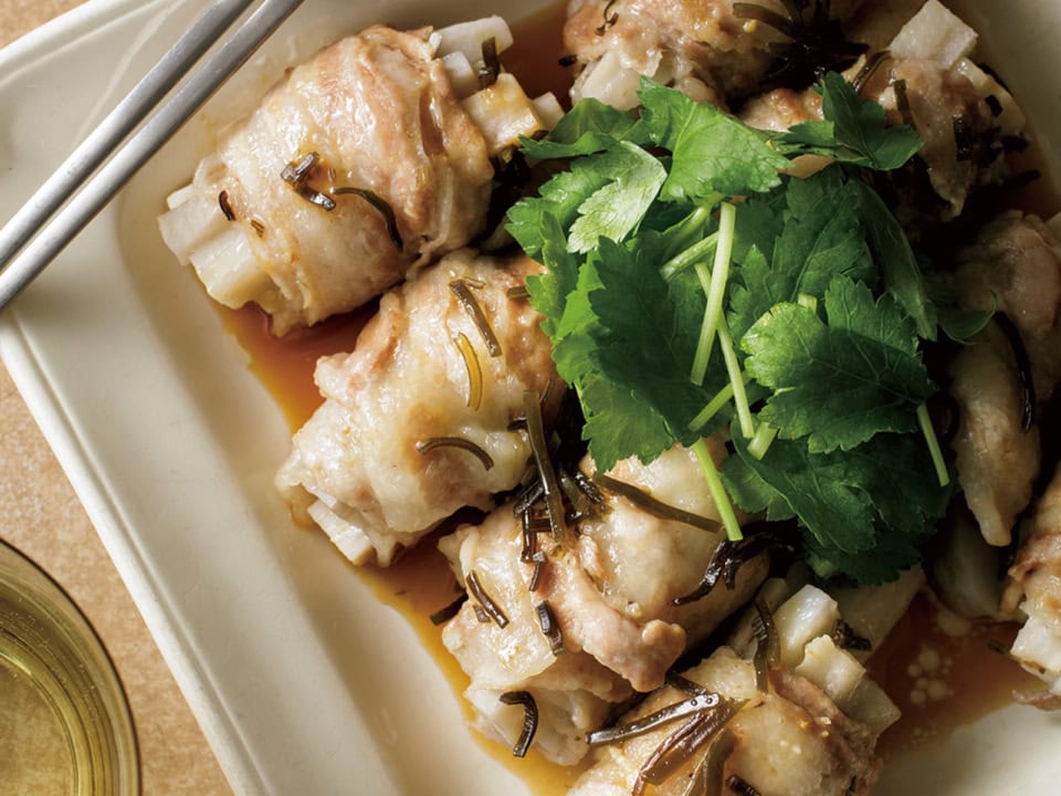 れんこんの肉巻き、塩昆布蒸し