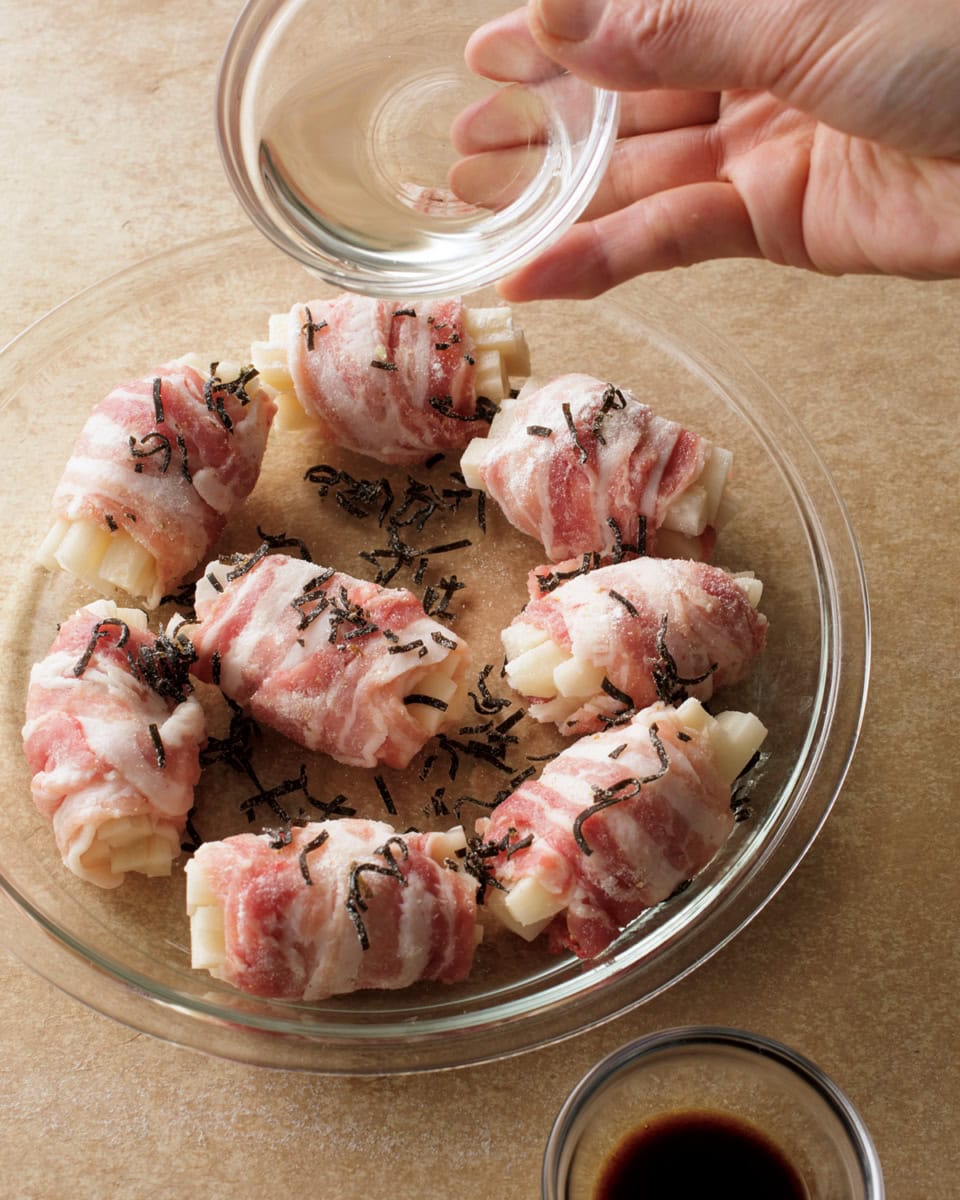 調味料はまんべんなくかけ、味に偏りが出ないように。肉巻きは少し間隔をあけて置くと、加熱後に肉同士がくっつきません。
