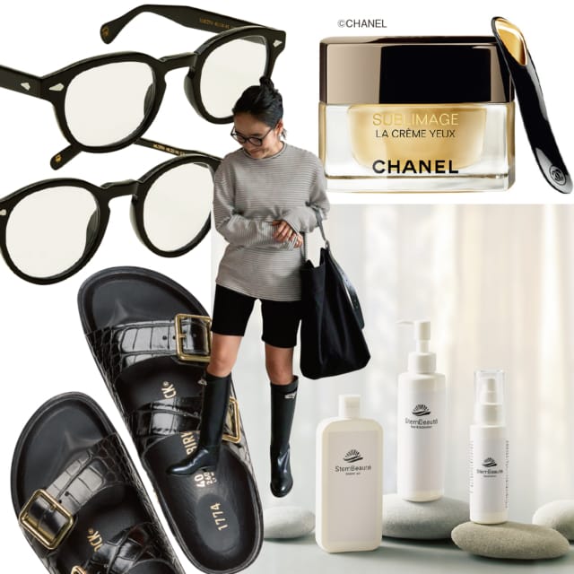 「ビルケンシュトックのアリゾナのサンダルと、黒ぶちメガネ。この2つは似たようなものを持っていても、追加追加してしまうアイテムです。黒のアリゾナだけで今4足あって、他人から見たら同じに見えるかもしれないけど、私にとっては全部違う。サングラスはブランドを問わず、MOSCOTなども愛用。ヒト幹細胞コスメのステムボーテのスキンケアラインはもう5年くらい使い続けていて、シャネルのサブリマージュのアイクリームは未来の自分のために、100年くらい愛用してる気分です(編集部注※発売は2017年です)」(金子さん)