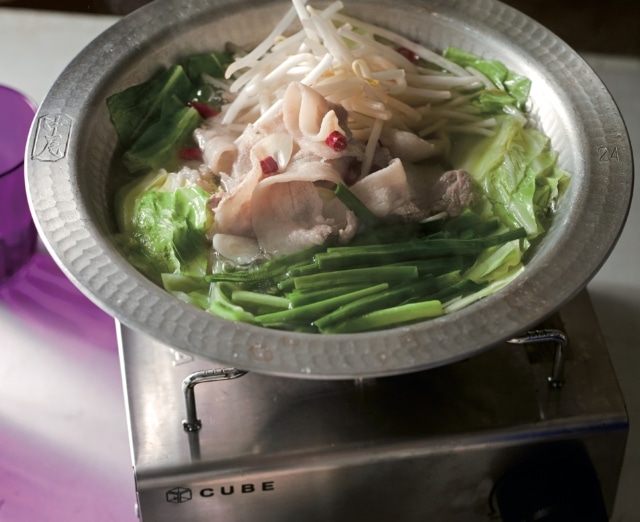 新鮮なモツを手に入れるのはなかなか難しいので、ジューシーな豚バラ肉を使ってモツ鍋風に! 味つけは酒と塩だけで、だし汁も必要ないのでとっても簡単! 鍋は煮汁ごと食べて素材の甘みや香りを存分に堪能しましょう。好みでラー油やゆずこしょうを足し、味変えをするのもオススメです。