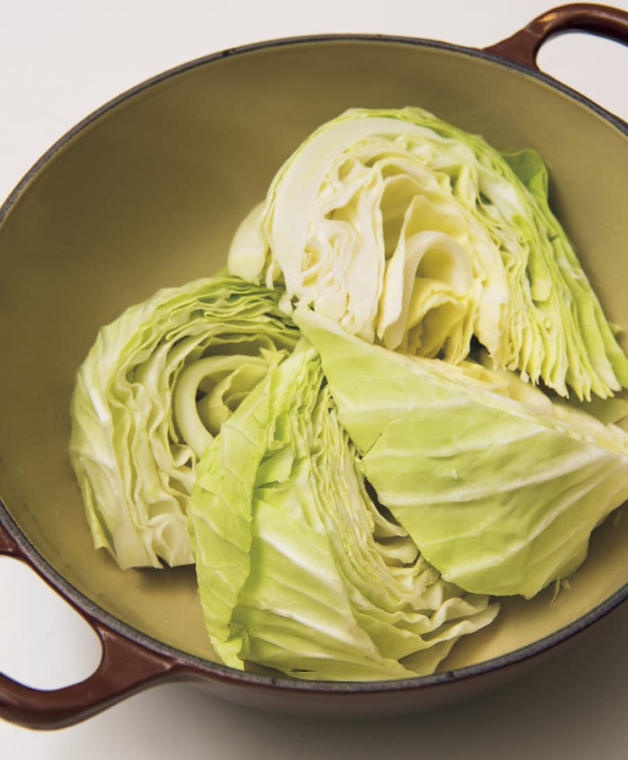 味付けが塩、酒、そして水だけで作れる、驚くほど簡単な一品です。一緒に食べる薬味で和風、洋風、エスニックと味わいを変化させられるのも魅力的。加熱するときはキャベツを一番下にすることで焦げつきを防ぎ、一番上にのせた豚肉のスープをじゃがいもが吸い込んでくれます。