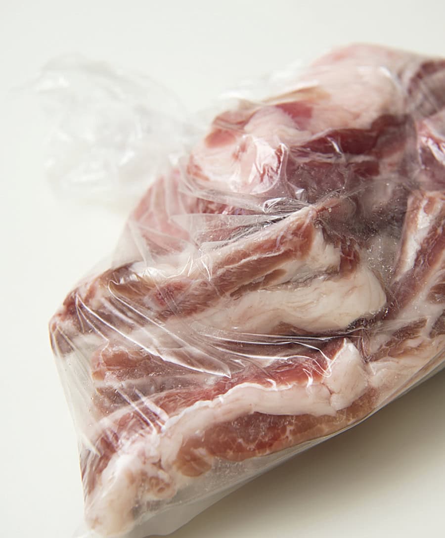 POINT❶_味の要となるのは塩豚! 豚肉に手で塩をすり込み、ポリ袋に入れて一晩から3日冷蔵庫に入れて保存しておく。