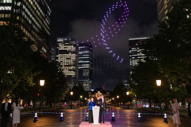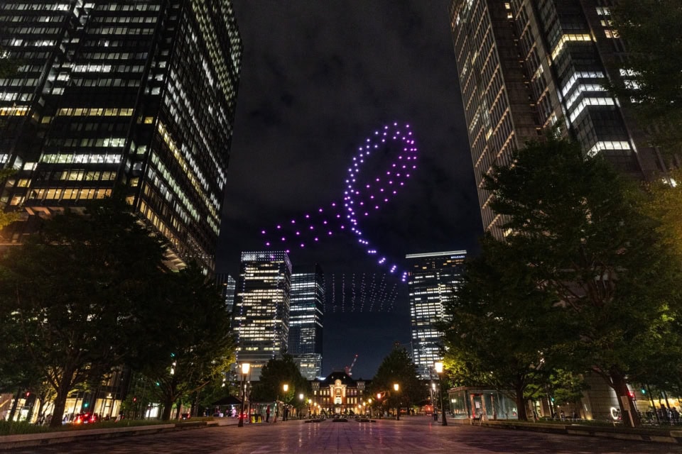 シークレットドローンショーも開催され、点灯式には小池百合子都知事が登壇。乳がんのない世界に向けて、ピンクに光るドローンがピンクリボンの形をつくり夜空を彩りました。