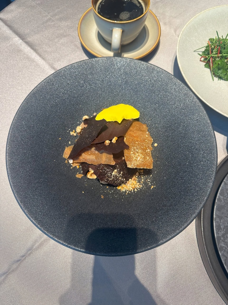 落ち葉を模した形のチョコレートの下に栗のエスプーマとシナモンを溶かしたアイスが添えられたデザートは、冷たいアイスとなめらかなエスプーマ、パリッとしたチョコレートの食感が絶妙。シナモンはただアイスに混ぜるのではなく、黒くなるまで焦がしてから乳製品に加えてアイスにすることでシナモンの香りがよりいっそう引き立つのだそう。
