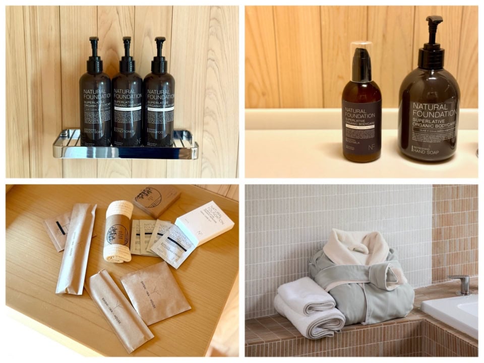 インバス、アウトバス、スキンケアキットは、オーガニックとサスティナビリティに拘ったイタリア「NATURAL FOUNDATION」。フィトテラピーをベースにしたユニセックスな香りです。また、竹製のヘアコームや歯ブラシ、チューブレスの歯磨き粉ペーパー、コットンのボディタオルなど、脱プラスティック、CO2排出量の削減を目指したアメニティも。タオルやバスローブは、世界の5つ星ホテルも愛用するブランド「Ploh」の特注品。肌触りはもちろんふかふかです。