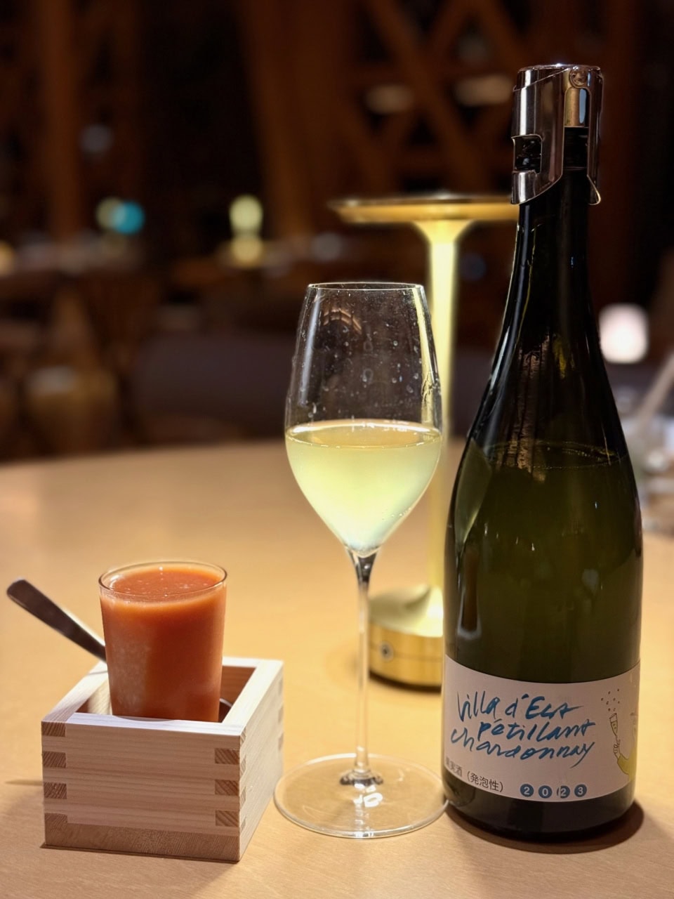 日本のワイナリーから選りすぐったワイン・セレクション。ペアリングコースのほかに、日本酒や季節のカクテルも充実です。右はワイン・ペアリングの1杯(ペアリングコース5,000円)。左は甘酒とトマトジュースのカクテル「AMELA AMAZAKE」(ノンアルコール1,500円)。飲む派も飲めない派も、バラエティ豊かなセレクションに大満足!