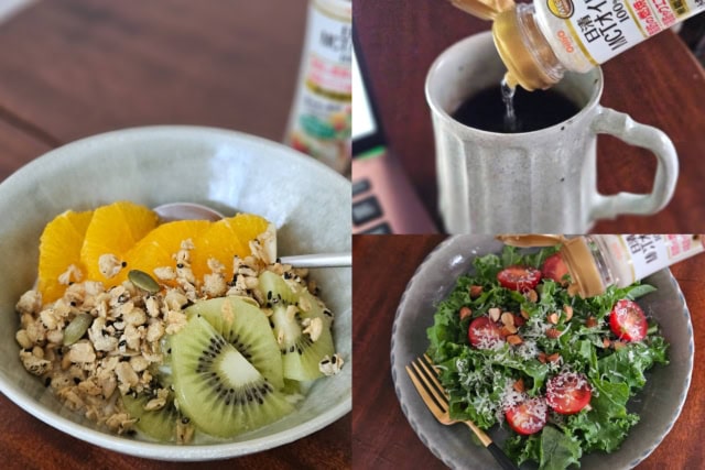 1日の摂取の目安量は小さじ1/2程度。コーヒーに入れたり、ヨーグルトやサラダにかけたり、その日の気分でアレンジして取り入れています!