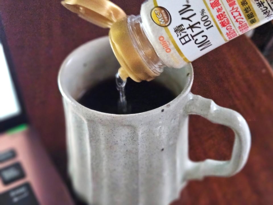 コーヒーに入れると、まろやかな風味になっておいしさが増す実感あり! つい甘いものもとりたくなるPC作業中のコーヒーブレイクも、コーヒー+MCTオイルで甘いものナシでも満足感が得られる気がします。コーヒー以外にも、野菜ジュースやスムージーなどなにに入れてもOK。ドリンクと一緒にとるのはものすごく手軽で効率よし!