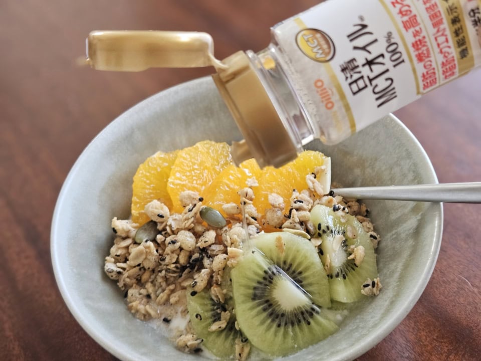 ヨーグルトにフルーツ&グラノーラを添え、MCTオイルをたらり! これで朝の始まりはパーフェクト!