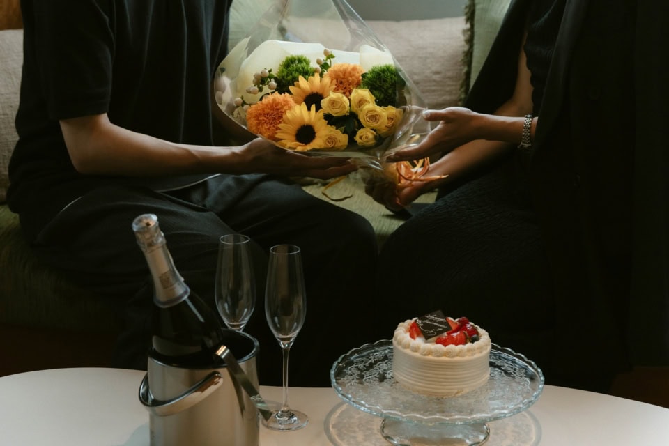 「パーティプラン」では、4号サイズのケーキとスパークリングワインをセットで用意。 誕生日や記念日はもちろん、仲の良いお友だちとの集まりにもぴったりなプラン。