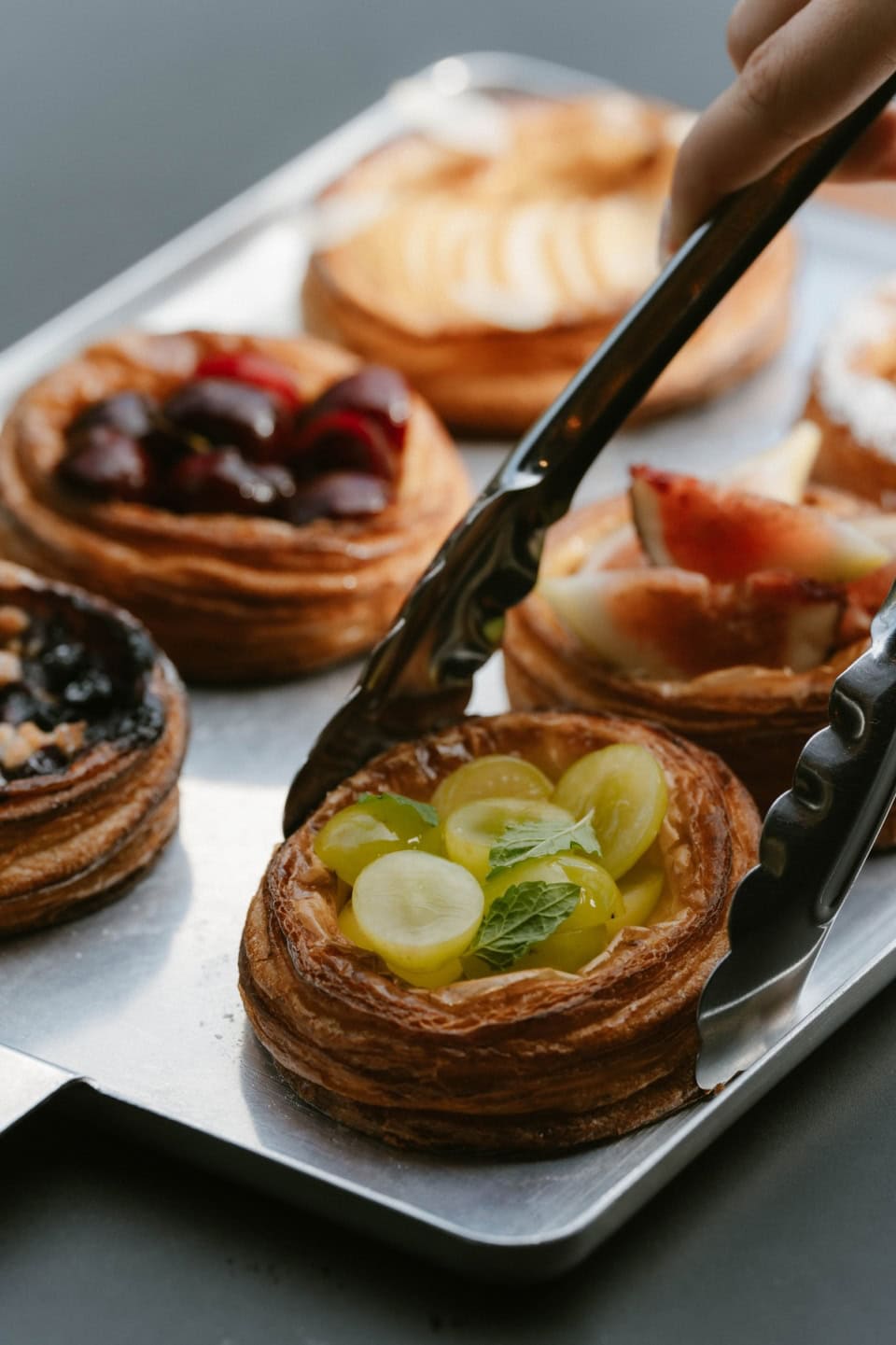 シグネチャーのクロワッサンはオーガニックシュガーでキャラメリゼすることで優しい甘さに。季節を彩るフルーツデニッシュは最高級の果物を使用し、薄い生地の食感とフルーツのみずみずしさがマッチ。