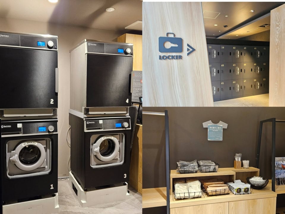 ホテルの1Fには長期滞在時に役立つランドリー(有料)や、チェックアウト後の荷物預かりにも対応するロッカーも完備。アメニティは必要なものをピックアップするスタイルで、時代のニーズにフィットしたホテルだと再実感しました。