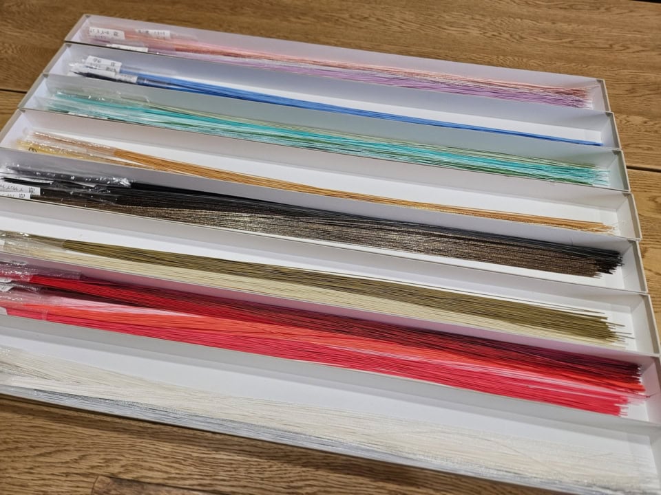 水引は長野や愛媛など水がきれいなところに産地があるそうで、和紙を細く裂いて水を含ませながら縒っていきこよりを作り、糊などで固めたところに、色のついた色やフィルムを巻き付けて作られています。何十色も用意された中から、まずは使いたい3本をチョイス。