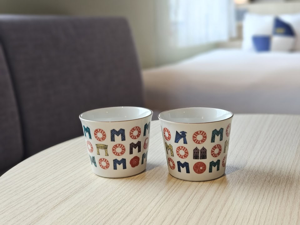 すべての客室に、オリジナルデザインの九谷焼のそばちょこや、雪つりデザインのクッションが配され、客室にいても金沢の文化に触れられるのもうれしいポイント。このかわいいそばちょこはフリーカップとして使用でき、お土産コーナーで販売も。旅の想い出にもぴったりです。