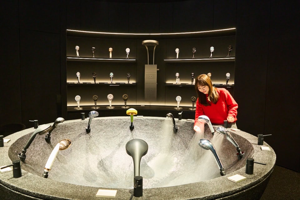 ファインバブルシャワーのエリアでは、中央に設置されたビッグボウルで全ラインナップの水流を実際に触って体験することができます。使用感や機能はもちろん、暗めの照明になっているから、水流の繊細な美しさまでじっくり見ることができ、自分にベストなアイテムを探すことができます。