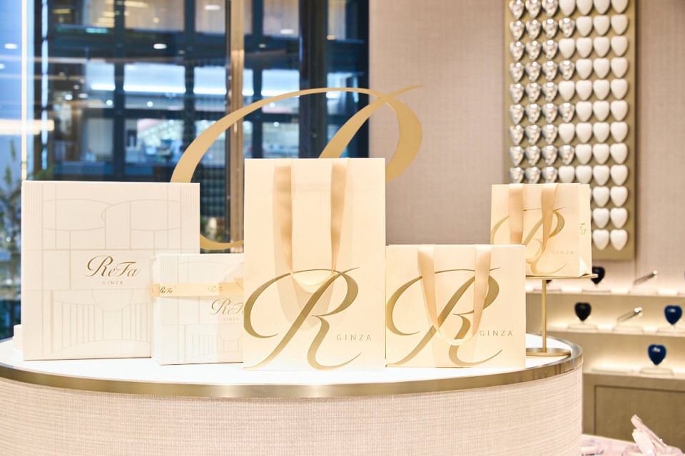 新たなシンボル「R」マークを大胆かつエレガントにデザインした、銀座店限定のショッピングバッグ(有料サービス)や、ReFa GINZAのシンボルであるスフィアモチーフとした、ショッピングバッグ、ボックス、リボン、チャームからなる銀座限定のギフトラッピング(有料サービス)も展開。