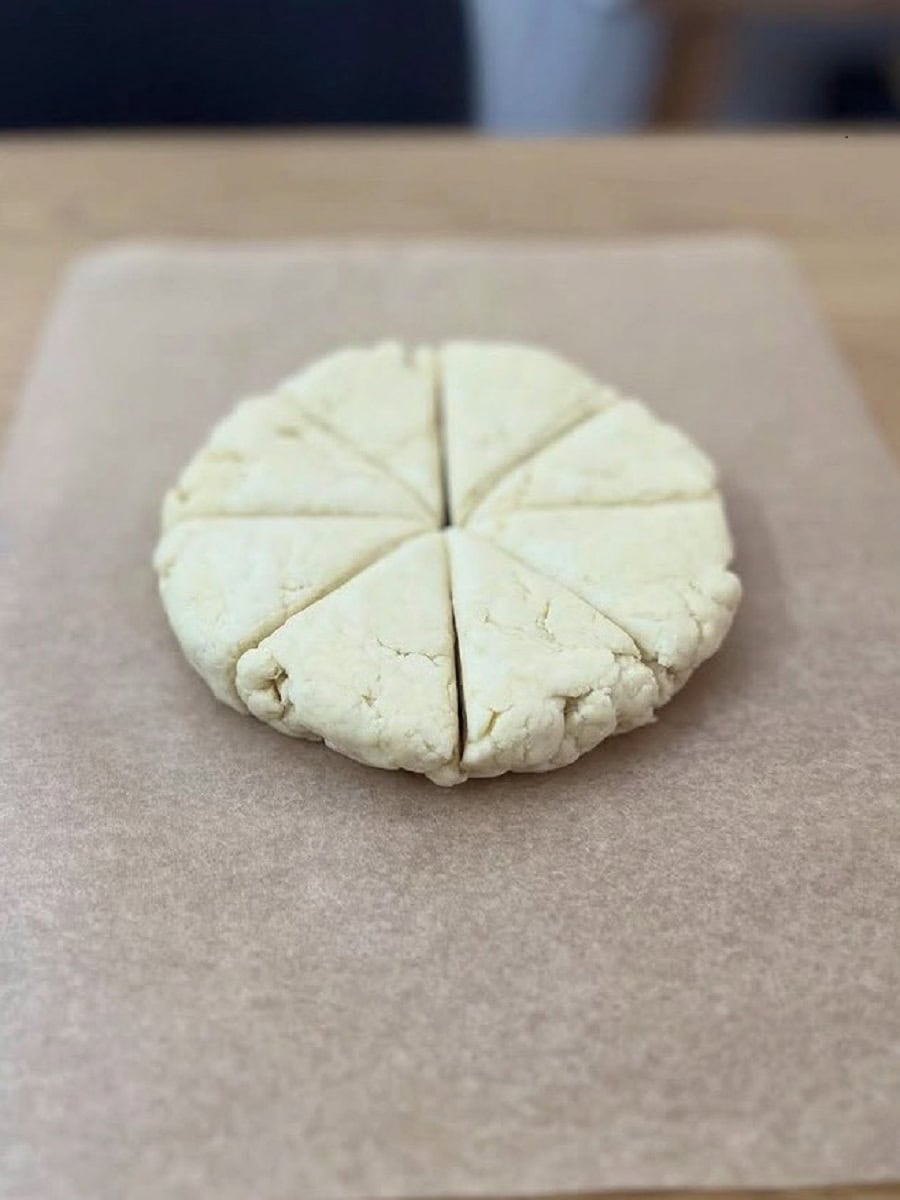 ⑤ 写真2のように8等分に包丁でカット (6等分でもOK )。切り分けた物をそれぞれペーパーをのせた天板におき、Bの液をハケかスプーンの背でスコーンの表面に塗る。