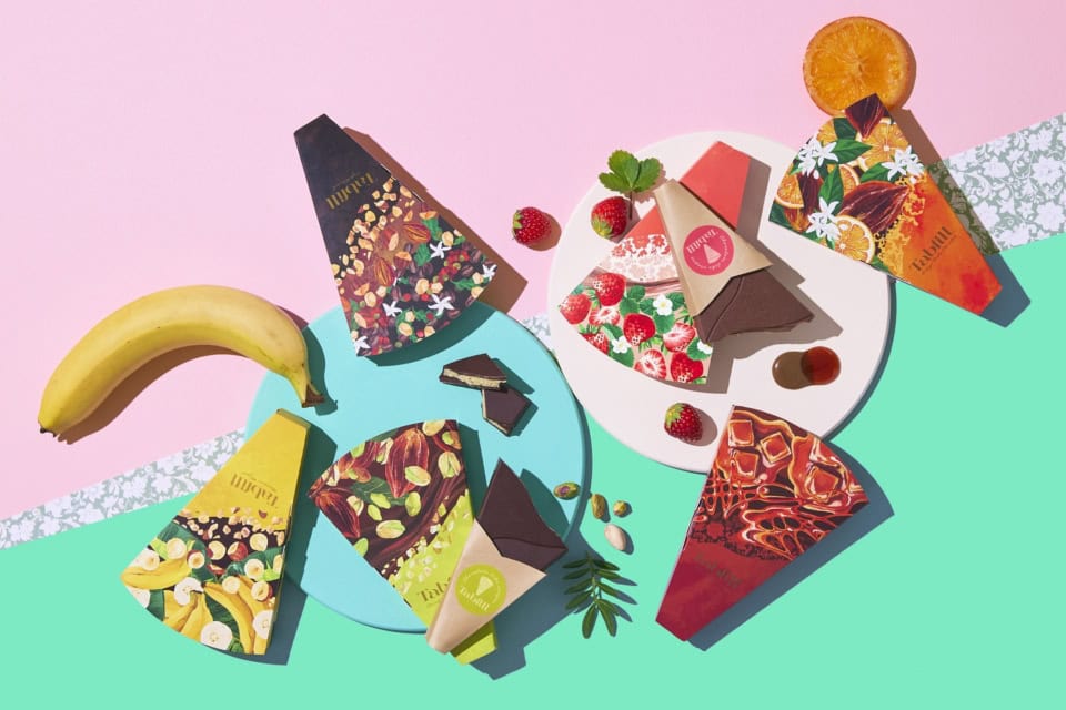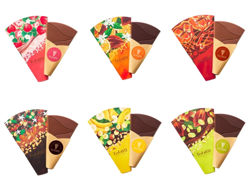「タブフィル」は、タブレットチョコレートとfill(満たす)を組み合わせた造語。とろみのあるソースや濃厚なガナッシュが包み込まれたチョコレートです。丸かじりした瞬間に広がる幸福感が魅力。全6種のフレーバーが揃い、ばらまき用にもぴったり!