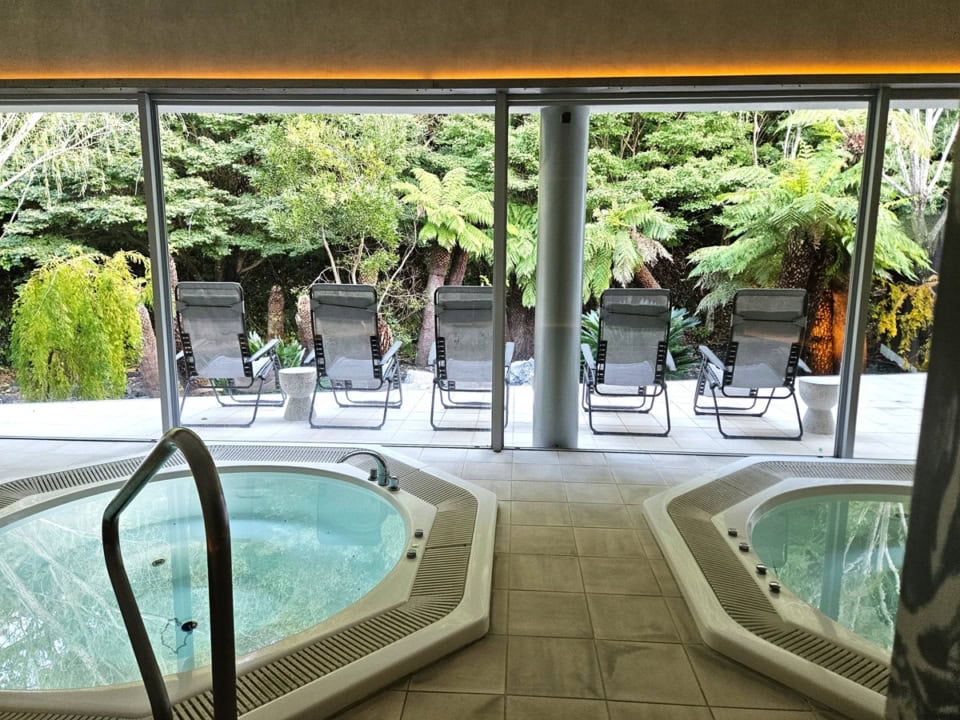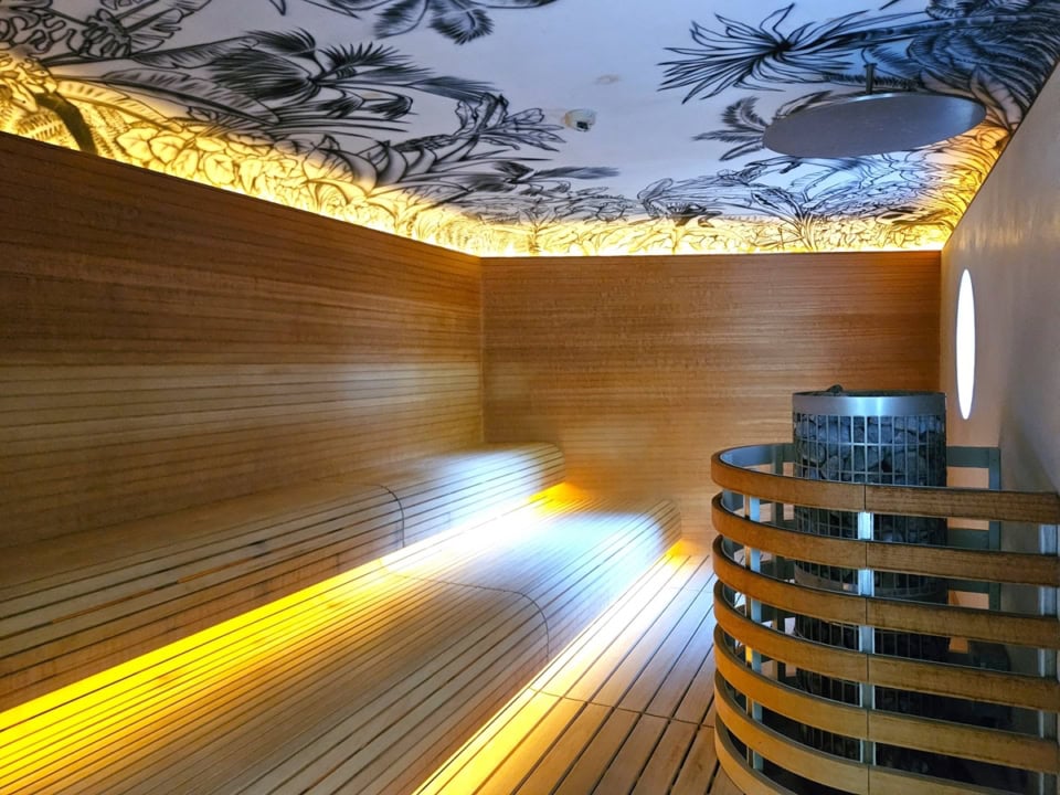 露天風呂感覚で癒されるホットプールに加え、ホテル内にはサウナが2か所。天井にジャングルが描かれた広々としたアーティスティックなサウナ「SWEAT LODGE」は、外気浴エリアも大充実。木生シダをはじめとする太古のユニークな植物が生い茂り、マイナスイオンに癒されることうけあい! サウナ&ジャグジーに向かう前のエリアも、思わず写真を撮りたくなるおしゃれさ♡