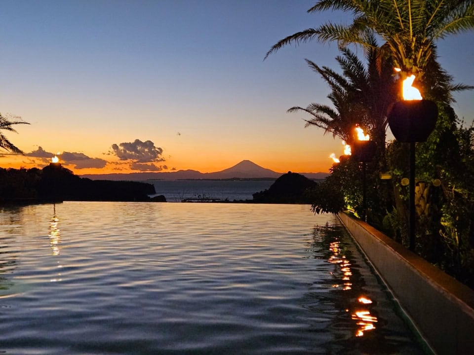 陽が山の中に隠れた後は雲がかかっていた空が徐々にクリアになっていき……オレンジ色に染まる空に富士山のシルエットがくっきり! 温かいプールに浸かって癒されながらのこの景色、控えめに言って最高です♡ 冬のほうが空気が澄んでいることが多いので、富士山のシルエットがより一層鮮明に際立つのだとか。