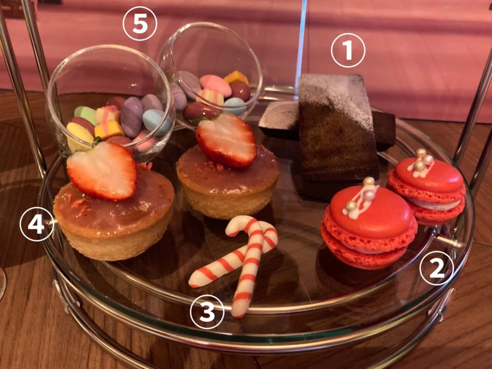①「お茶の踊り」のフィナンシェ、②クリスマスオーナメントのマカロン、③「トレパックの踊り」のキャンディケーン、④「ミルリトンの踊り」のタルト、⑤「金平糖の精」のドラジェ