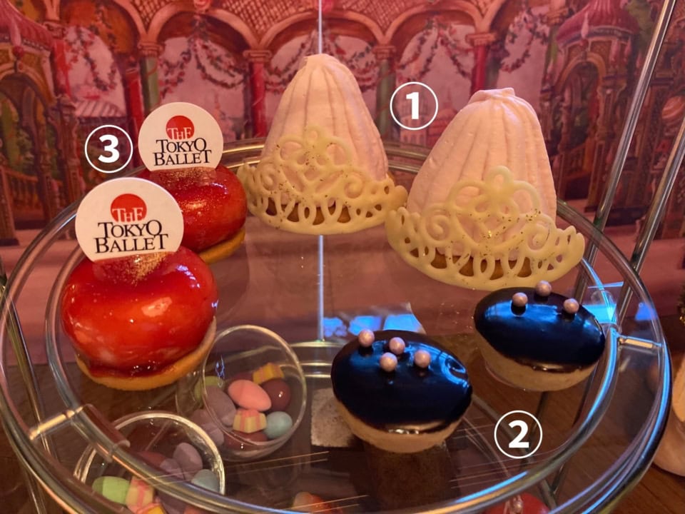 ①金平糖の精・バレリーナのケーキ、②「くるみ割り人形」の帽子のムース、③「チョコレートの踊り」のタルト