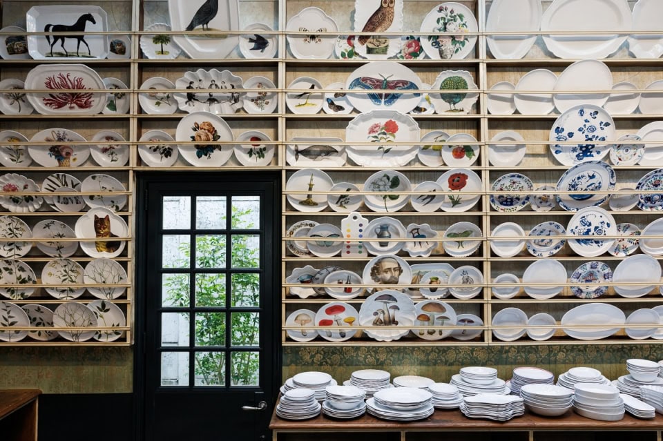 ラックに埋め尽くされた圧巻の白く美しい陶器に加え、あらゆる種類の装飾品やリングカップ、キャンドルホルダー、ゴブレット、ピッチャーやお皿が溢れています。
