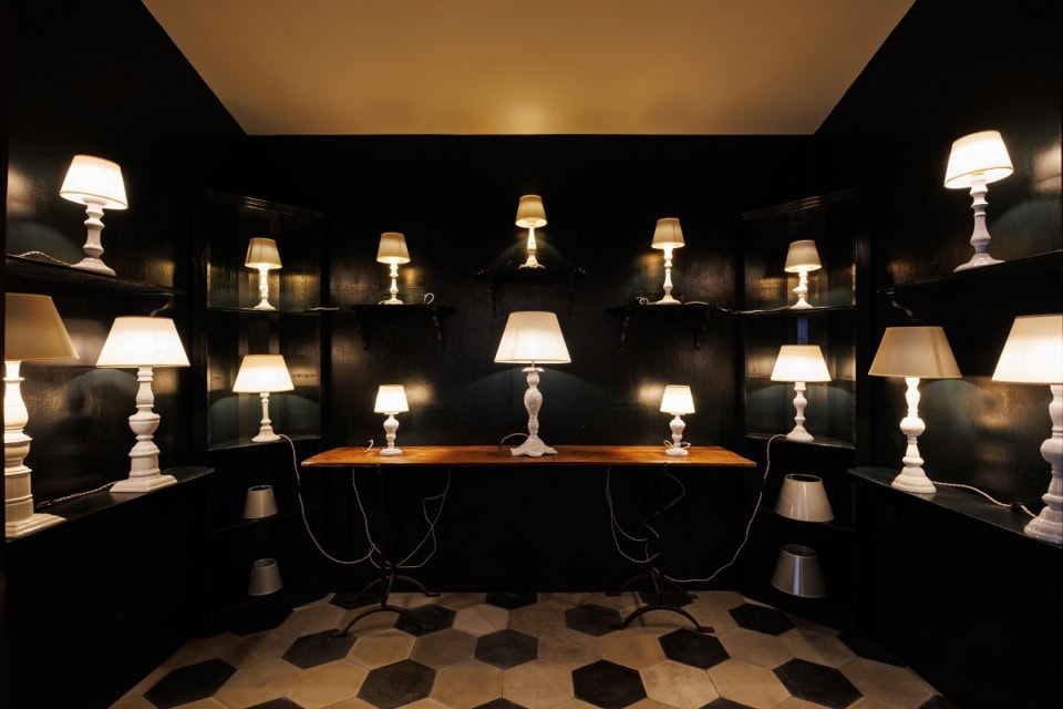 奥の小部屋には大小様々な形をした数十もの白い陶器製のランプが所狭しと並んだ空間が。