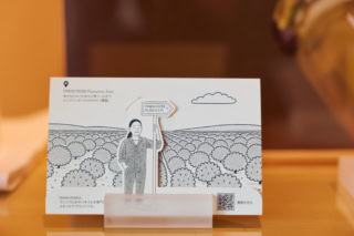 ブランドストーリーをかわいらしいイラストで紹介したポップアップカードも用意。上質なホホバオイルと出合ってからは「同じような肌悩みを抱える人の希望になりたい」と製品づくりをスタートしたそう。