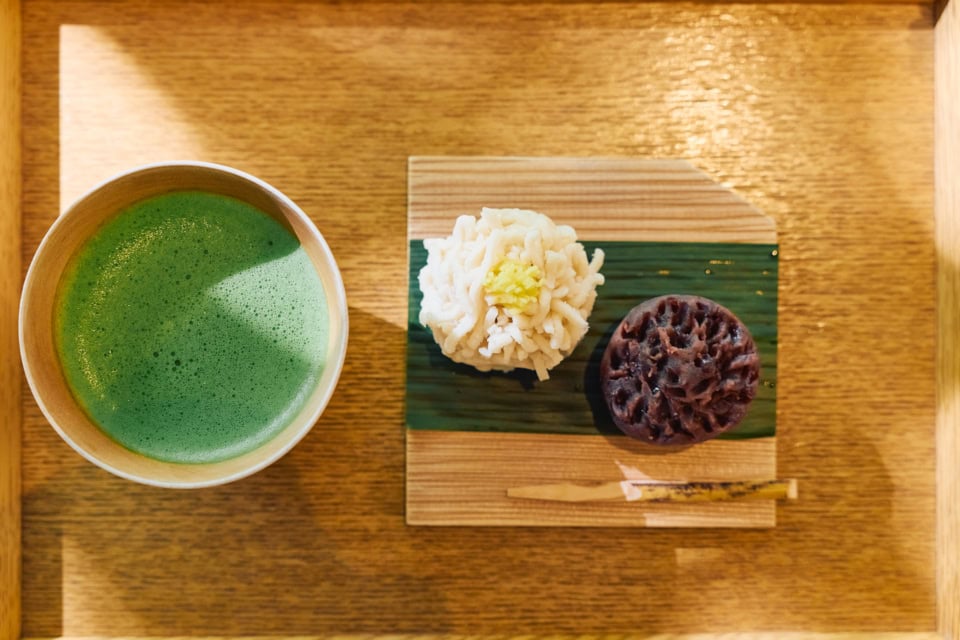 抹茶とともにゲストに振る舞われたのは、菊の花と嵯峨菊をイメージした2種類の和菓子。発表会シーズンでより多忙なゲストをやさしい甘さで癒します。