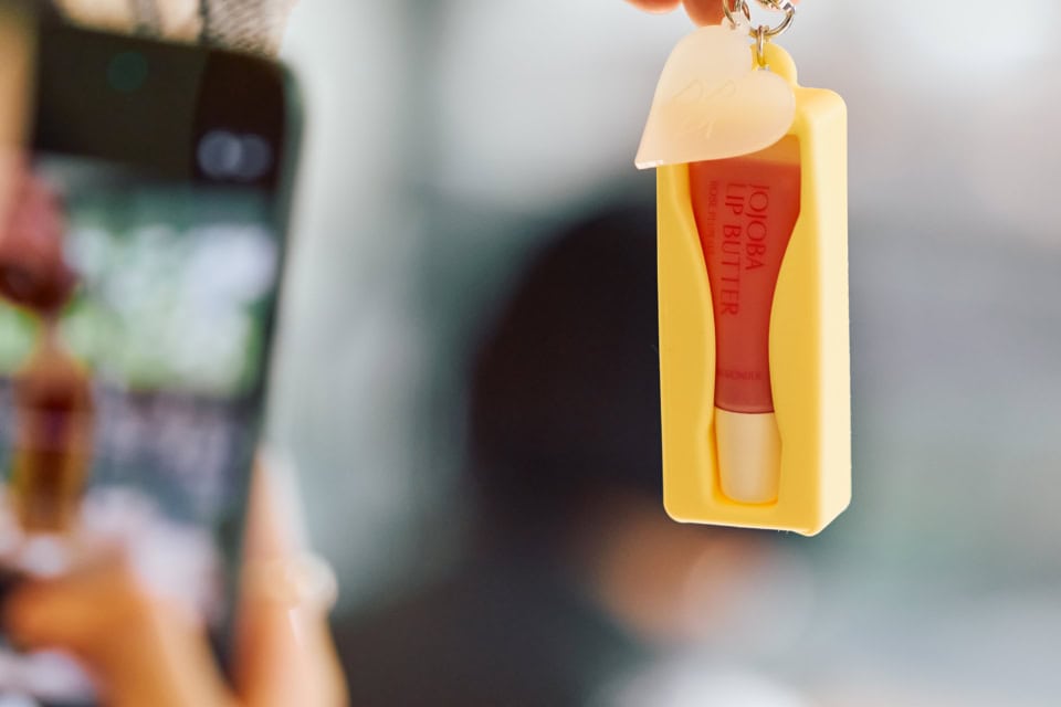 ゴールデンホホバ種オイルとオーガニックバーバリーフルーツエキスを配合した「ホホバカラーリップバター」(7.5g 2800円)は、別売りのマイリップバターキーリング(2800円)にセットすればバッグのチャームとしても。