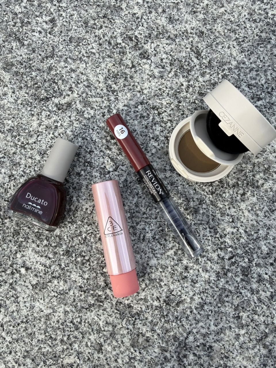 右から:生え際や分け目にぽんぽんするだけ!ヘアメイクパウダー 02 ¥880(セザンヌ)、濃密なプラムカラーがひと塗りでおしゃれな指先に。デュカート ネイルマイン 43 ¥495(シャンティ)、とろけ出すツヤと濃密カラーが唇とほっぺに”幸″発色。3CE グレイジーリップグロウ 34(3CE)、色持ちとツヤ感が16時間!なリップ。レブロン カラーステイ オーバータイム リップカラー N 380 ¥1,760※2026年1月26日限定発売