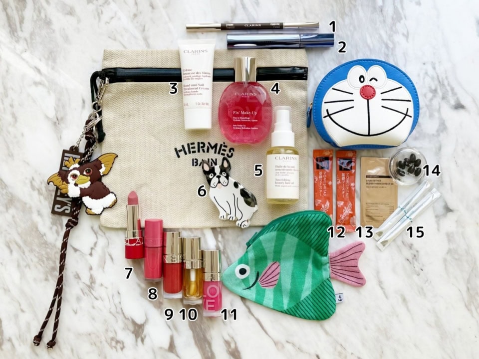 クラランス・PRの【ポーチの中身】質感違いのリップ5本が主役!保湿ケア&サプリもしっかり常備