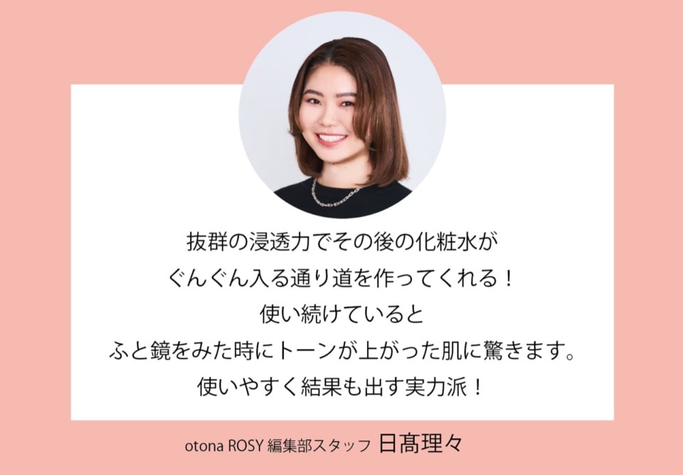 「夜はもちろん、朝も使いやすいベタつきのないさらっとしたテクスチャーで肌なじみがいいばかりか、次に使う化粧水の浸透も格段によくなります。使ううちにハリが出てきたからか、頬の毛穴まで気にならなくなってきました。くすみやハリ不足など、大人が気になる悩みをまとめて解消してくれる頼もしい美容液」