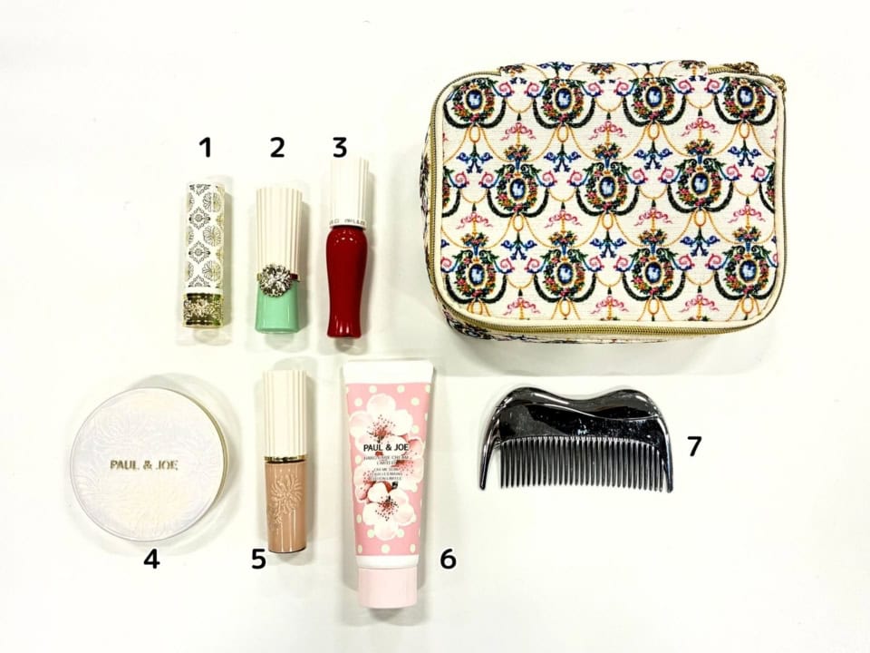「ポーチは2025年ポール & ジョー ボーテのクリスマスアイテム。マチもしっかりあり、お化粧直し用のアイテムやハンドクリームなどもしっかり入ります! 見た目も華やかで鞄から取り出すたび、心が躍ります。ポーチの中身は、室内外の両方を行き来することも多いのでベースのお直しアイテム+気分転換用にリップを数種類。リップはその日のメイクに合わせて色を変えて持ち歩いています。乾燥時期にハンドクリームも必須。この先の新製品を普段から使いこんでいます」